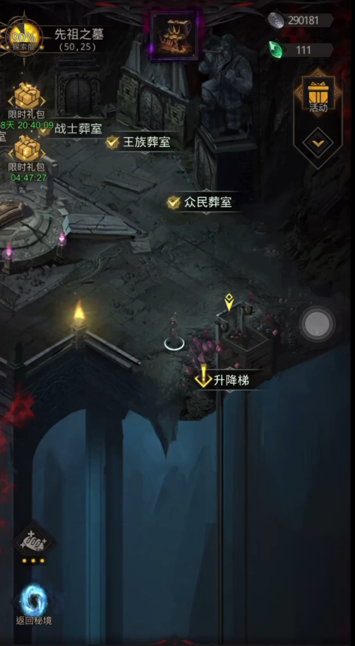 我们把印记放入地图中的国王棺椁,就可以完成这一部分的内容了,接着可以去往右侧的升降梯打前面魅影。这里小编提醒各位玩家我们尽量按照顺序来打,从离自己最近的墓室一个一个推过去,如果顺序乱的话很有可能会丢掉众民葬室的印记!