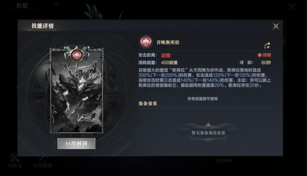 3、终极技能—召唤斯库拉:召唤强大的魔宠“斯库拉”从天而降为你作战,斯库拉落地时造成大量的伤害。斯库拉连续攻击时第三击造成额外的伤害。主动技能玩家可以跳上斯库拉的背部操纵它,操纵期间伤害提高20%。斯库拉存在20秒。