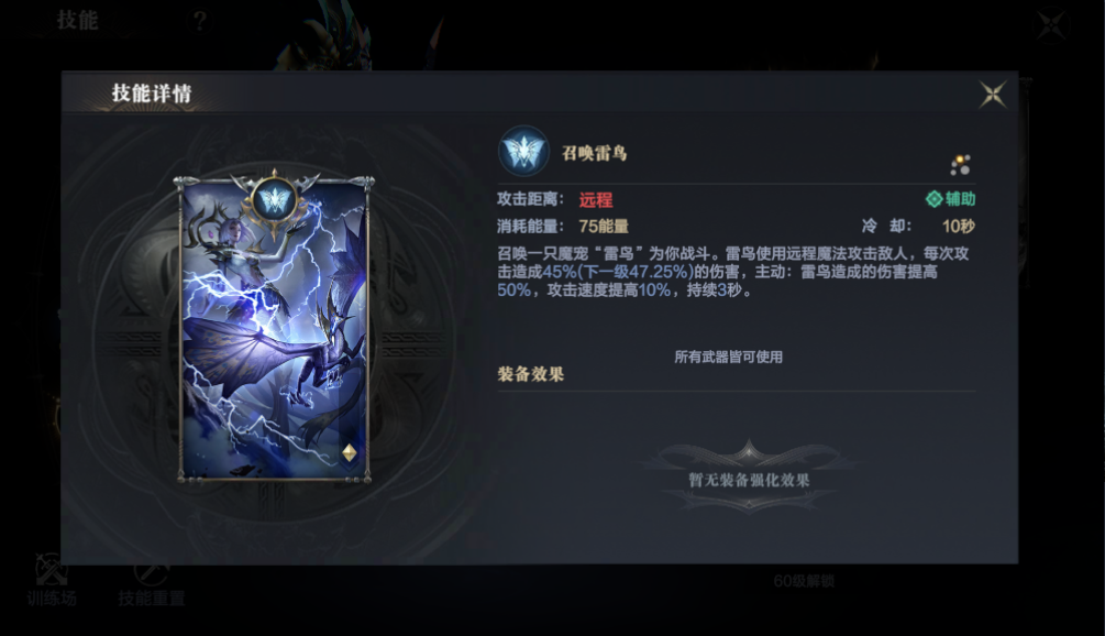 2、辅助技能—召唤雷鸟:召唤一只魔宠“雷鸟”为你战斗。雷马使用远程魔法攻击敌人。主动攻击后雷鸟造成的伤害提高50%,攻击速度提高10%,持续时间为3秒。