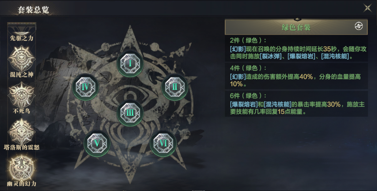 1、这一套“幽灵的幻力”符文套装需要玩家到达145级时才能开启,这一套符文套装可以对其战术技能“幻影”进行强化。强化后的幻影在释放技能后可以召唤出一个幻影出来,幻影可以继承自己一定的生命值,而且这个幻影还能释放自己说携带的其他技能(不可以继续使用幻影)。