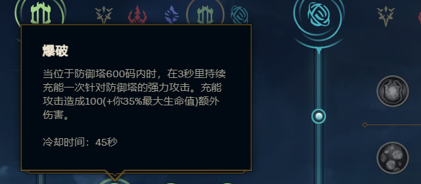 说到推塔玩家都会想到爆破,所以爆破也是塞恩必带的一个天赋,爆破触发后可以对防御塔造成100+携带者生命值百分比的伤害,大大加快了塞恩的推塔速度,尤其是对线期一个爆破差不多就是一个镀层。