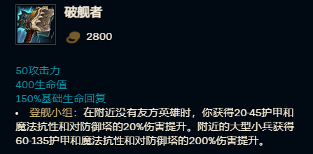 破舰者塞恩必出装备破舰者,甚至这个流派的塞恩就是第一件裸破舰者,破舰者提供的400点生命值和50点攻击力都非常契合塞恩。因为是单带,所以破舰者的被动可以为塞恩提供的额外的双抗、对塔造成的伤害以及强化小兵,都非常利于塞恩单带推塔。增加双抗和塔上玩家都很好理解,但是在强化小兵这点也非常同样,玩家需要记住在没有线的时候推塔是有减伤的,所以强化小兵对破舰者塞恩推塔的帮助实际上非常大,有时候甚至需要塞恩开W抗塔保小兵。
