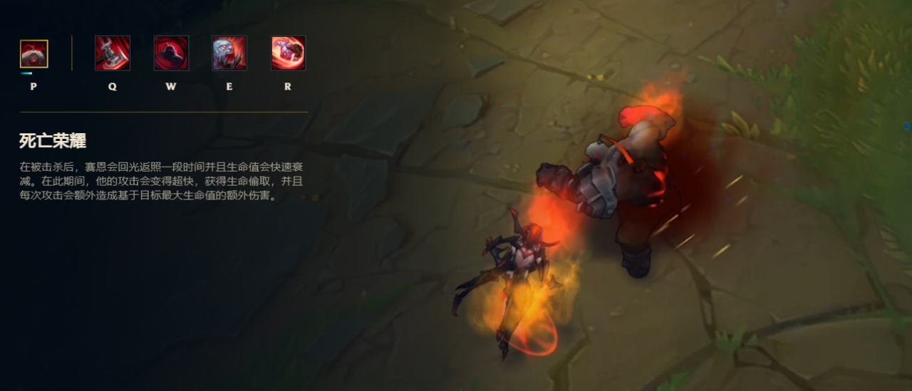 塞恩在死亡后被动可以化为满血,但是生命值会持续削减的丧尸,在这期间塞恩的攻速会大大提升。这一点大家都不难理解,因为早在破舰者没推出,就有纯靠被动的送死流塞恩。因为有被动的存在,所以很多时候塞恩即死死了,也能靠着被动把塔推掉,或者是完成极限1换1。