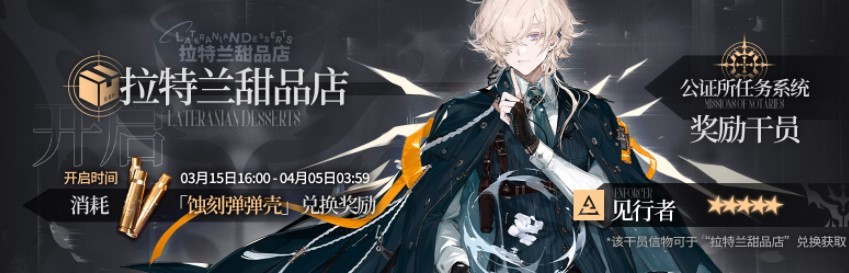 主要奖励:活动干员【★★★★★:见行者】、【拉特兰公证所休息室】家具(部分)、蚀刻弹弹壳