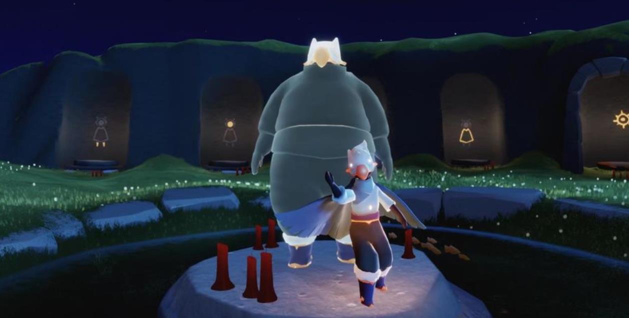 2、在大石头台子这里停下来,绕到其背后,就能找到此次复刻的先祖了,然后小伙伴们就能够找先祖去兑换自己需要的装扮物品了哦。