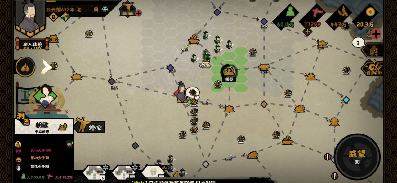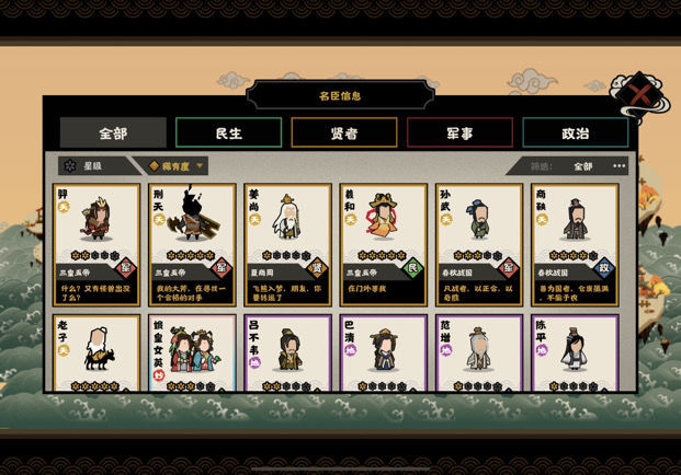 不同的名臣刷好感度也不同,一般民生是摆放到80好感然后结盟获取民生好感。再就是军事,只有1个国家的时候,3次决战胜利,然后退游戏。政治这里则是通过自循环来提升政治,也可以用会盟来硬刷。