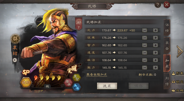 评价:该阵容不仅多为A级战法,因此消耗的战法点不多,而且sp袁绍+朱儁是T0级的开荒队伍,转器械也非常不错,因此建议作为第一队使用,后期沮授上场,面对大部分主流阵容都有不错的胜率。