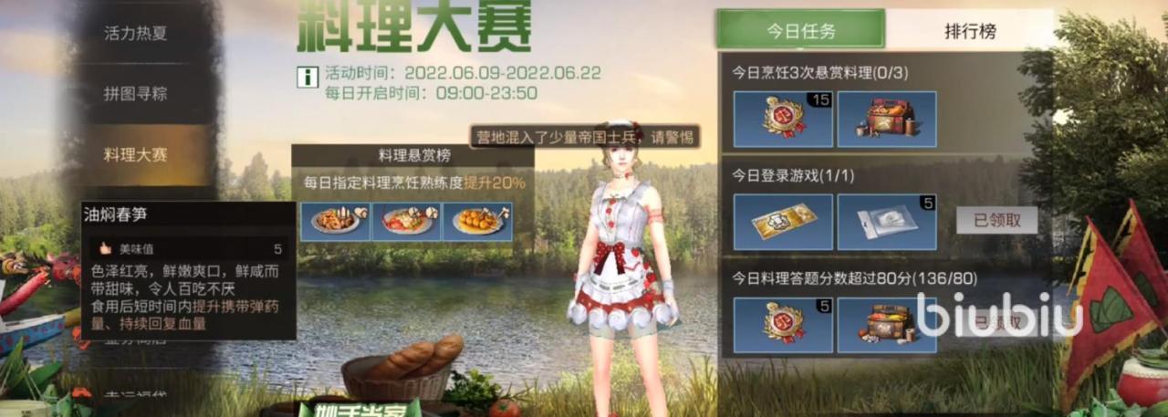 此外,在每天的9点到23点五十分期间,小伙伴们还能通过答题卡,也可以去营地喷泉那里,或者去101入口找莫妮卡,就能进行烹饪答题,完成答题将能领取神秘图谱礼包、以及排行奖励哦。