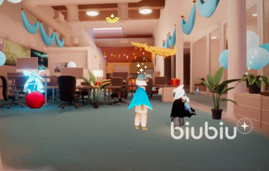 此次的三周年庆活动地图就在禁阁办公室,和以往一样,小伙伴们进入办公室,在里面就能看到此次的活动先祖了,就是站在过道中间的那个带生日王冠的小蓝,找他就能兑换周年庆物品了哦。