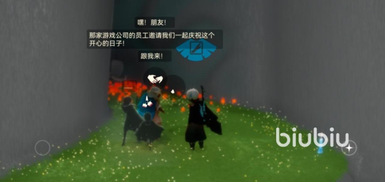 2、穿过裂缝之后,小伙伴们在屏障前方可以找到一个小蓝,上前和小蓝进行对话,点一下交谈的动作就能和他对话了,之后点牵手按钮,对方会牵着各位一起进去;