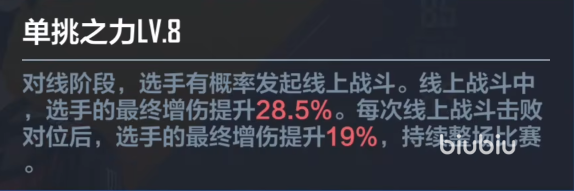 knight的个人能力还是十分出众,并且非常是2019年全明星周末的中路solo冠军,所以在《英雄联盟电竞经理》中,他的技能为单挑之力,单挑时会获得增伤,并且单挑击败敌人也会在本场获得最终增伤。所以如果玩家在想玩纯对线流派,knight是非常优秀的选择,可以压制大多数中单选手。