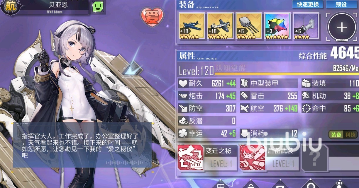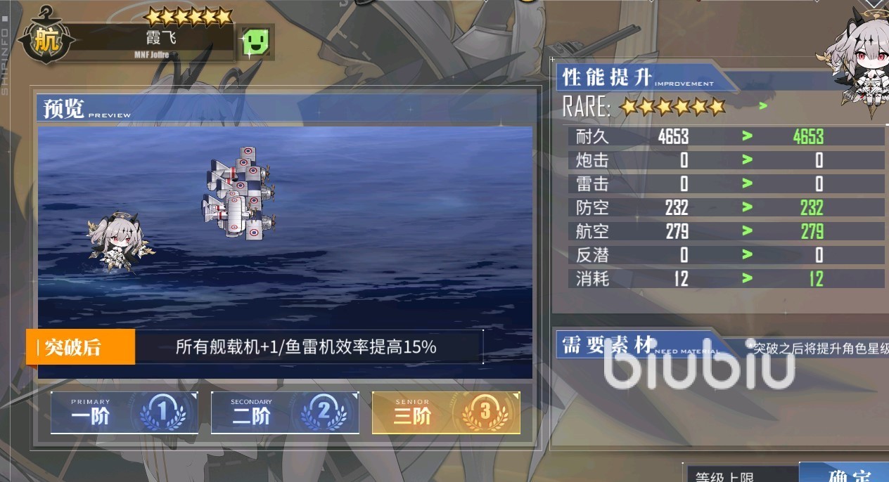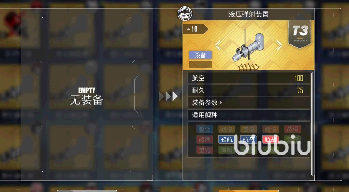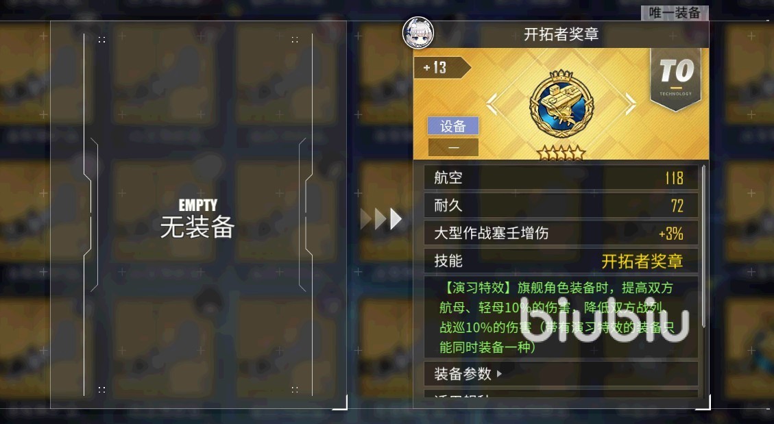 首先,这件装备属于设备类型的,并且只能给航母、轻航以及航战这种类型的舰船使用。基础属性方面初始有30点航空值2点技能机动值。强化+10航空90机动12点,因为是金装所以可以强化到加13。加13后航空值106机动值15。加11的时候获得大型作战3%增伤。