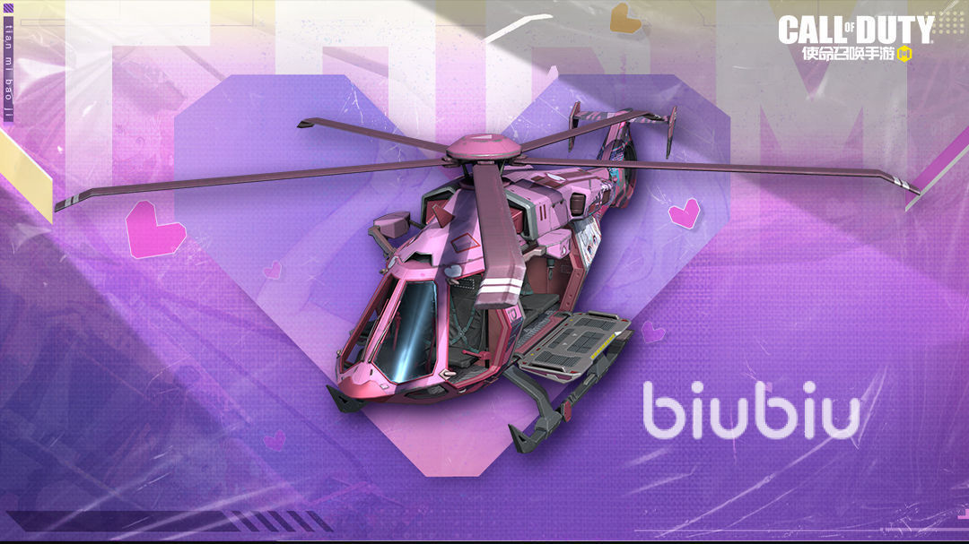 然后我们来看看这次奖池里的2件重要皮肤,首先是甜蜜暴击,是一款直升机皮肤,整个机身涂成了粉红色,看上去很有少女心。