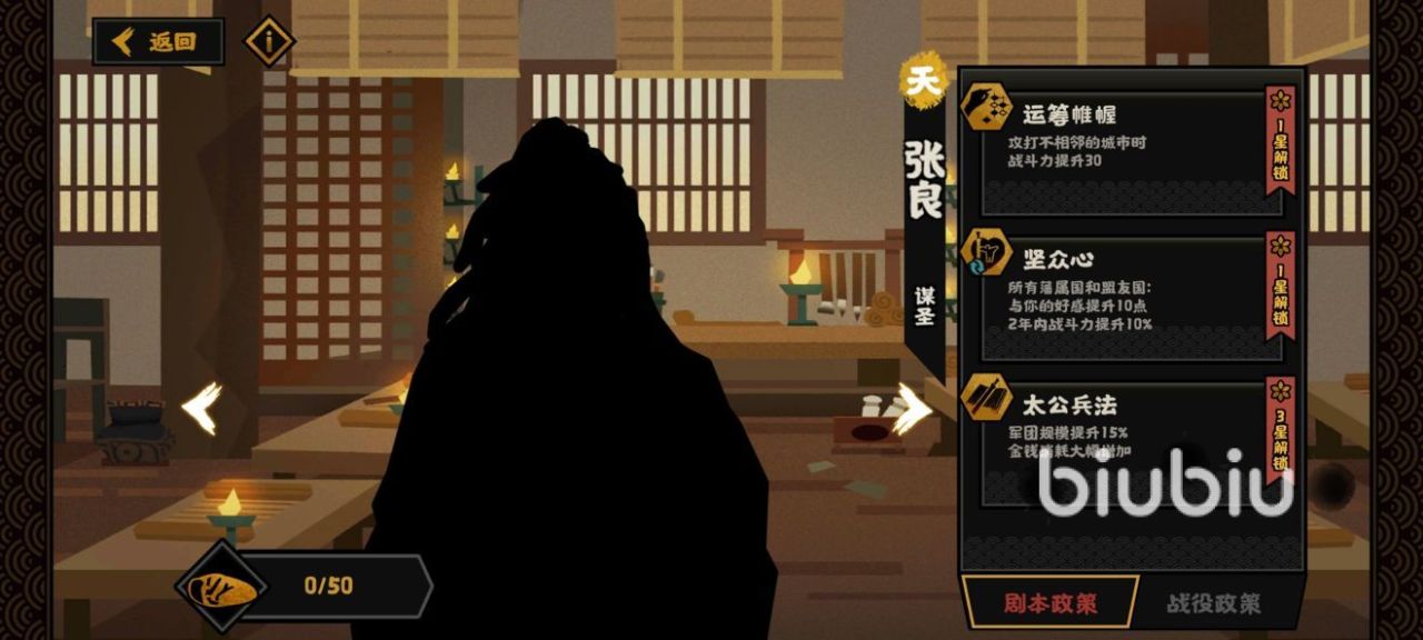 第四个则是张良,也是这一时期的一个知名人物了,其技能的具体效果就是,如果小伙伴们去打非相邻城市的话,能提供一定的战力加成,同时也能提供一定的盟国战力加成。换一句话来说,小伙伴们结盟的国家势力越多,就等于自己的助力越多,在打其他势力的时候就能更为高效率了。如果解散联盟的话,其盟国buff也会一同没有哦。