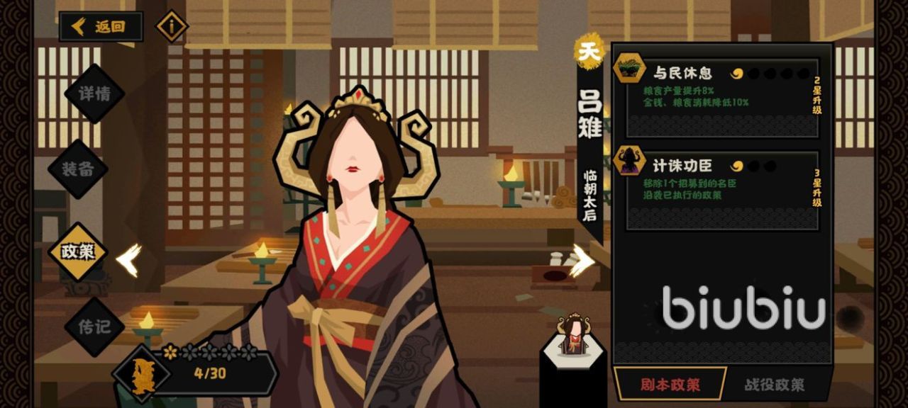 在此次的秦楚汉剧本里面,有四个角色是相当亮眼的,第一个就是吕后了,也是历史上相当有名的一个女性人物了,她的出现则让游戏里多出了一个新玩法,其技能简单一点来说,就是让一个已有的角色下场,不过对方的技能依旧有效,而这个空出来的位子就可以继续招下一个人了,如果将该技能提升到最高等级的话,她最多可以让三个人下去,也就是能继续多招三个。
