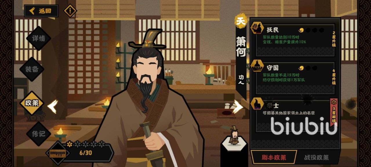 第三个是萧何,这个“老熟人”想必小伙伴们也是经常耳闻的,毕竟“成也萧何败萧何”这句话可谓是深入人心了,而在游戏里面,小伙伴们将其提升为三星的话,就能得到一个举士的技能,其效果就是可以招到别国的名臣,如果让他来搭配吕后的话,小伙伴们搞不好在前期的时候就能集齐十个名臣了,而且如果顺利防守的话,则可以得到一万的部队补充,如此一来就更是如虎添翼了。