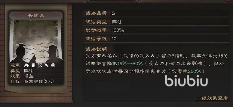 而长蛇阵,它作为一个S级的增益阵法技,同时也是一个群体技,只要阵容里有两个武将的武力值高于智力值的三倍,一旦己方阵容被敌人谋略攻击的话,那么其伤害就能最高降低百分之三十,不过这个阵法也是有一个不太好的地方,就是它会有额外的水攻伤害,一旦被水攻的话就会损失一定的兵力。