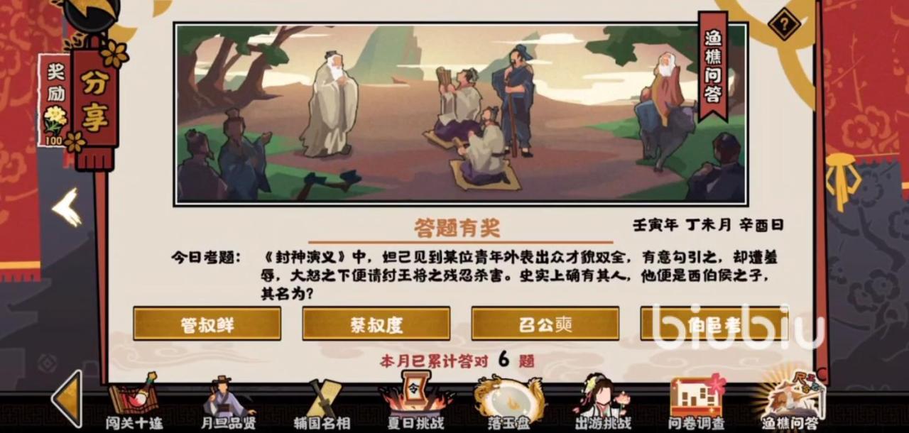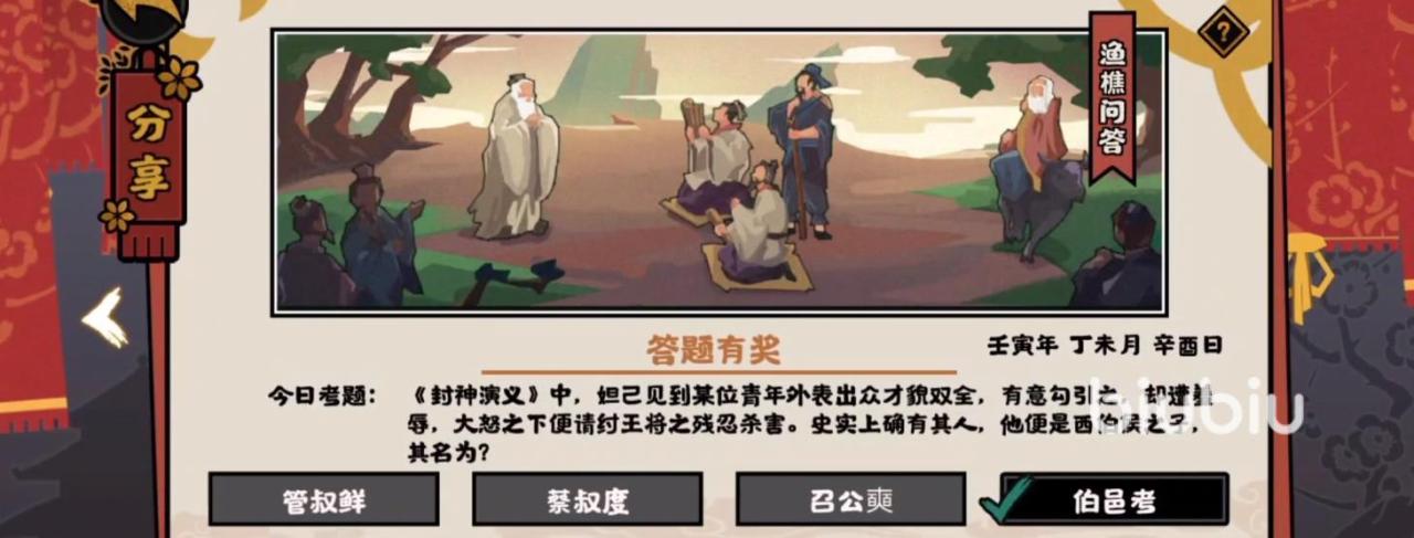 今日份的考题就个人来看,真的是没有什么难度可言,它主要考的就是封神演义里的一个知名人物,小伙伴们其实只要看过封神榜相关的影视剧,这个答案简直是呼之欲出了,它就是最后一个选项——伯邑考!