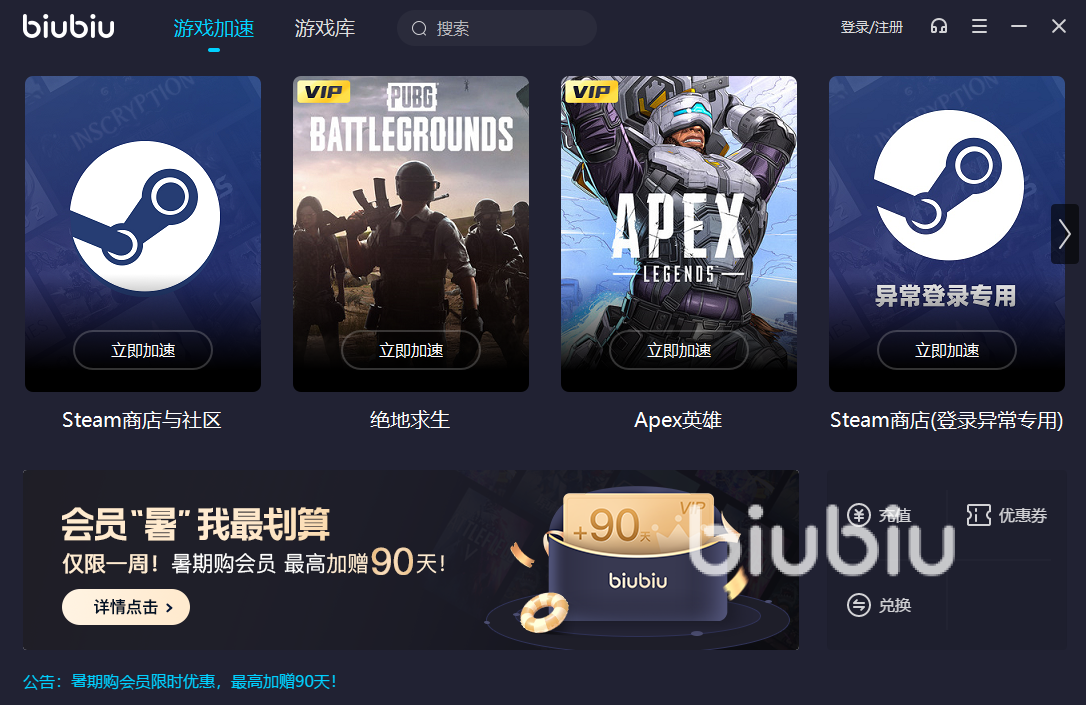 平台会给用户提供三天的免费使用,相比其他加速器,后期的价格也比较实惠,相信很多玩家在选择加速器时会考虑到性价比问题,能节省一笔支出用在游戏上,再合适不过。其次就是用户们最关注的实用性问题,这里完全不用担心,首先,biubiu加速器采用双通道加速,在游戏下载速度方面就有明显提高,不用过多等待就可以开始畅玩游戏。