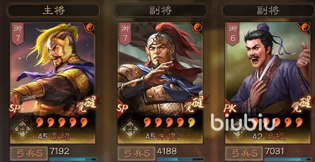 第一个推荐的阵容就是法弓队,其中的主将是一个sp角色,就是小伙伴们都不陌生的袁本初了,副将里面也是有一个sp,而他就是朱公伟了,另一个副将则是沮监军了。战法上,主将带的是文武以及火炽,两个副将的话,前者是焰逐以及无当,后者则是八门以及婴城了。