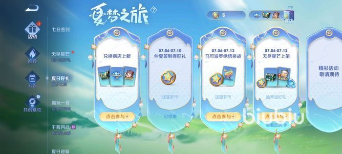 首先小伙伴们需要直接进入游戏,然后将视线放到最右侧的活动图标中,点击这个图标将弹出很多小活动,在这些小活动中有一个名字叫夏梦之旅,进入它后就能在右上角发现夏日商店啦!