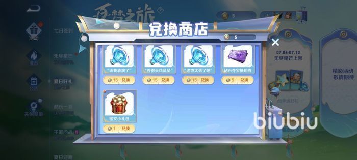 夏日商店中一共有九种东西,分别是夏日限定播报(三十个兑换币)、限定手势随机礼包(二十五个兑换币)、限定送你花花(十五个兑换币)、限定油菜花(十五个兑换币)。