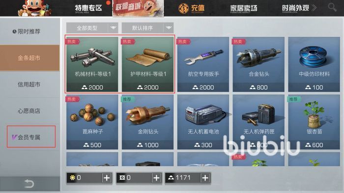 其中分别有特惠专区、联盟商店、充值、家具卖场、时尚外观,你们点击里面的联盟商场,此时右边将出现很多不同的商品,选择会员专属里可以发现很多零件,不过他们也是有数量限制的,直接拉满就行,最后一个是和教官进行买卖,也可以直接获得。