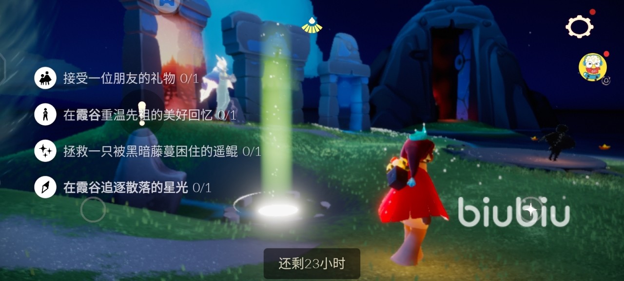 不得不说,今日份终于告别了冥想,最后一个日常则是迎来了追星光,而这个星光就位于霞谷的滑冰场上,各位飞到滑冰场,就能看到一个很亮的光团,追它就对了。