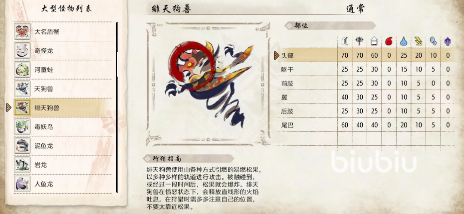 绯天狗兽的击杀难度并不是很高,提升自身提升火耐性,在击杀时注意与松果的距离,避免吃到爆炸伤害,主要攻击头部、翼、尾巴,尾巴立起时攻击会倒地,这时可以可以打出大幅输出。