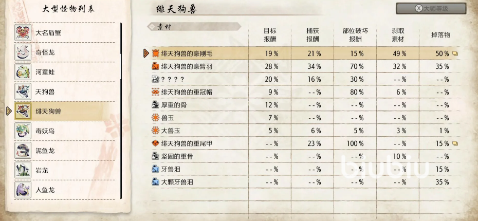 击杀后几率掉落:绯天狗兽的豪刚毛、绯天狗兽的豪臂羽、???、绯天狗兽的重冠帽、厚重的骨、兽玉、大兽玉、绯天狗兽的重尾甲、坚固的重骨、牙兽泪、大颗牙兽泪