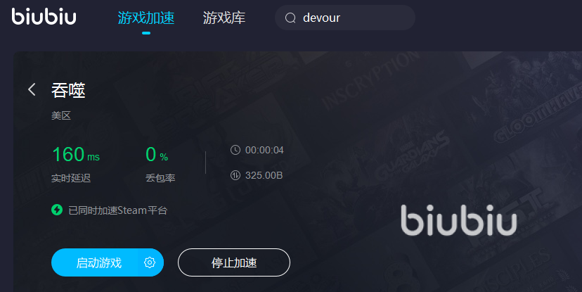 Devour这款游戏,是3D版的多人在线探索的恐怖性质的游戏,很考验玩家的胆量和承受度。玩家可以选择单人,也可以选择多人,进行闯关。不过游戏运行起来之后,难免会出现延迟卡顿现象,特别是在联机的时候,那这个时候,加速器就派上用处了。