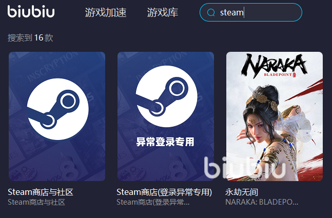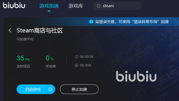 在biubiu加速器上,玩家可以搜索到steam相关的板块有两个,一个是正常加速使用的,一个是出现登录异常后,可独立使用的,考虑的很全面。开启加速后,玩家能真实感受到操作的流畅度提高了,也能看到加速前后的延迟对比,更有网络速度数据,切实感受biubiu的低延迟,高下载功能。