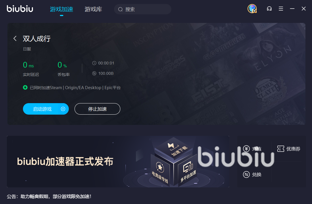 biubiu加速器针对于steam平台、Ea平台、以及epic平台都有着特的加速渠道,目前steam平台是可以免费加速的,而双人成行加速之后可以达到23毫秒的延迟,更容易让大家的操作同步到对方好友的电脑上。