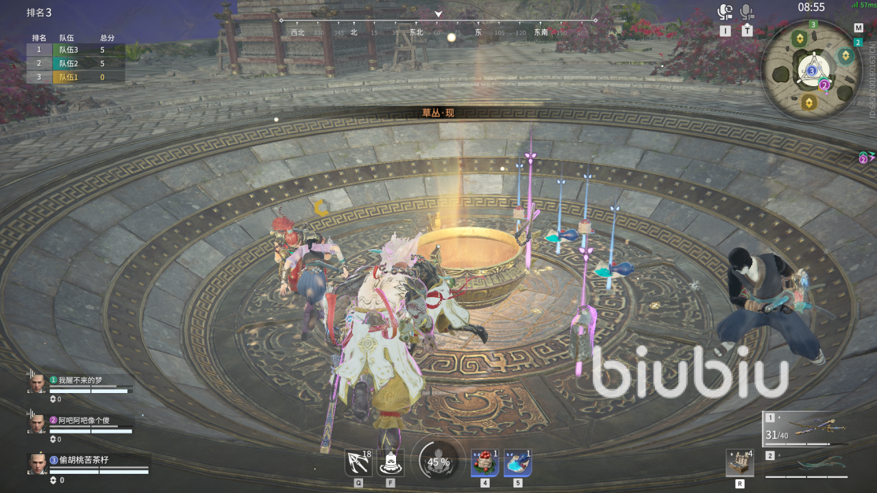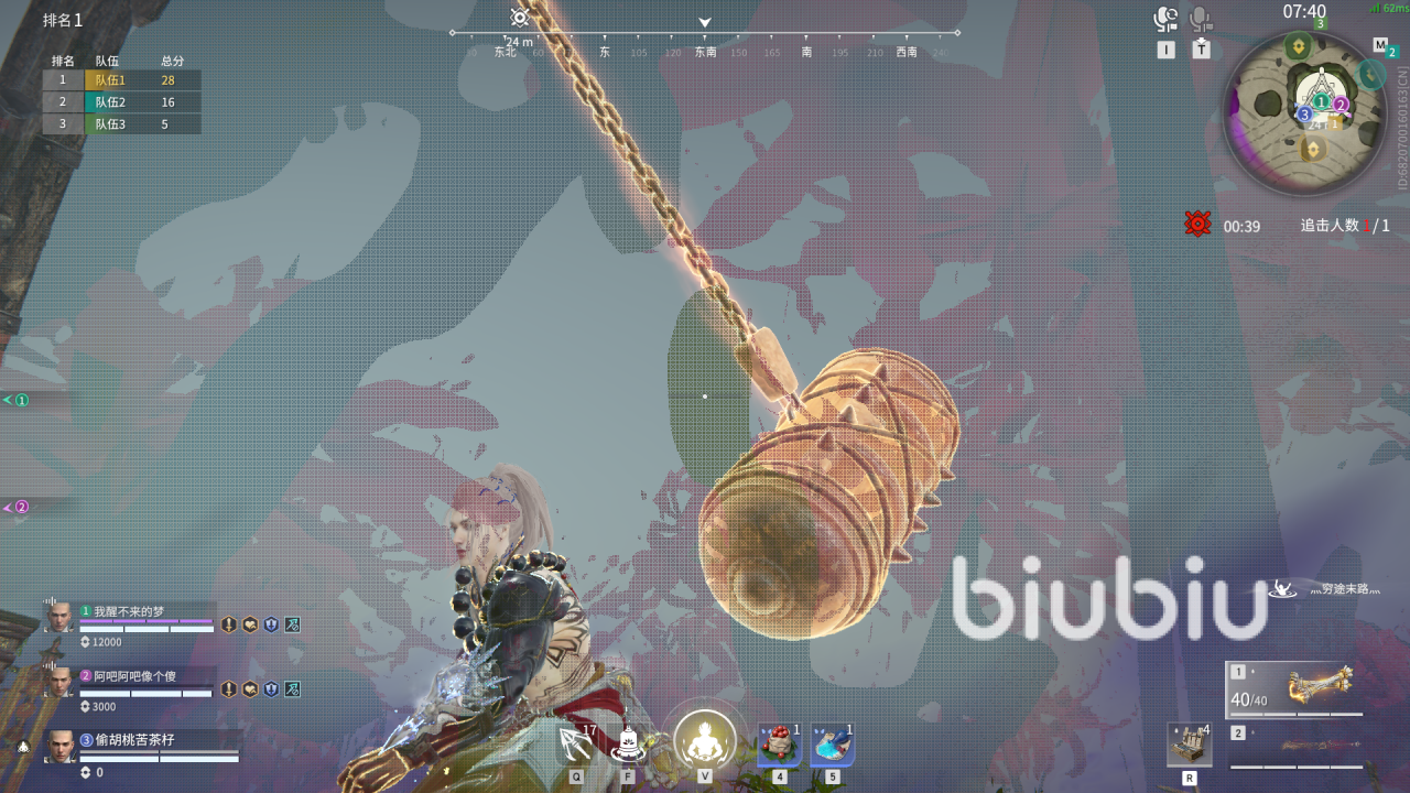 地图中央有一个混沌玲珑鼎,在这里会随机刷新金魂玉、紫魂玉、金品质武器以及紫品质武器,玩家们的初始武器都是白色品质,在货郎中购买可获得蓝色或紫色品质武器。要说此模式最大的亮点,莫过于地图中央的两个大摆锤,当玩家被摆锤击中,会被击飞很远一段距离。对应的,在地图中心点刷新的魂玉中,新增了【升龙·摆锤】以及【千斤坠·摆锤】两种全新魂玉,能让玩家们在升龙和下落的过程中击飞敌人,非常有趣。