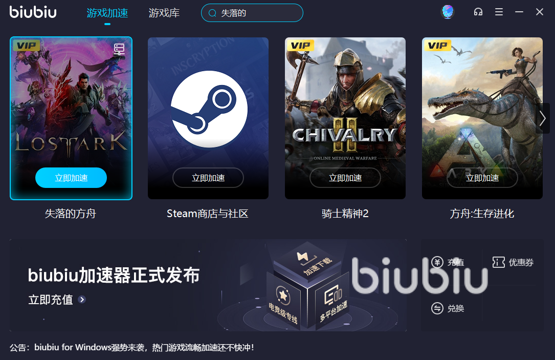 biubiu加速器可以完美的解决失落的方舟游戏运行延迟高,丢包情况严重,但是登录游戏界面很缓慢,游戏运行之后也会非常的卡顿,每一项操作都得需要等半天的情况,这不仅影响玩家们玩游戏的心情,还很影响在游戏里面的发挥。