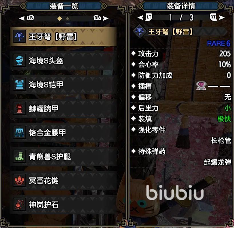 武器介绍完了接下来就是护具了。护具方面还是推荐大家优先做出这几个:海境头盔,海境盔甲,赫耀腕甲,合金腰甲,青熊兽腿甲。技能方面弱点3,精神3,节约弹药3装弹速度3速射3会心2装弹扩充2后座2活性1。