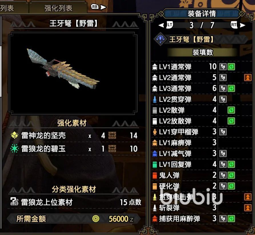 可选择的轻弩有很多,这里想推荐给大家的是雷狼弩。其主要的优点还是装填快,此外会心率还高,输出起来不拖后腿。配合恰当的技能输出效率更是卓群,技能建议是选择穿甲榴弹,开场的时候直接使用,可以直接将怪物控住,这时候再连上一套爆发,直接将伤害拉满。其余的技能选择方面优先选择伤害属性。