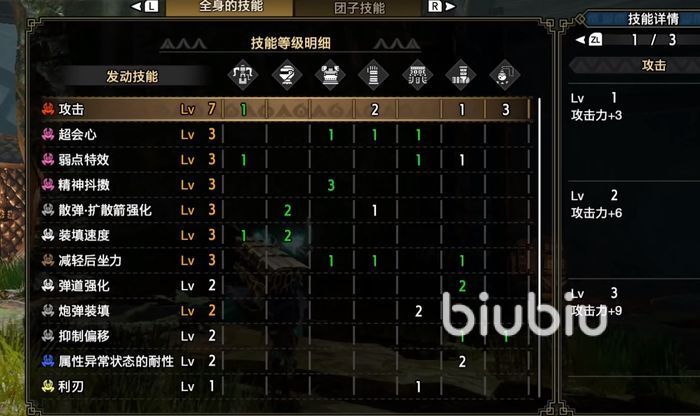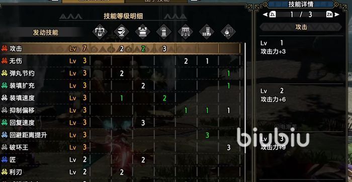 这里我们的精神抖擞可以在我们连续攻击到怪物的时候,也可以稳定提升不少的暴击率,这样的话我们在面对一些怪物的时候,即使比较难打出弱点,此时也可以打出暴击的效果。然后散弹强化以及装填速度的提升这个就没啥好说的,毕竟可以进一步提升我们的输出效率。以及输出的强度。