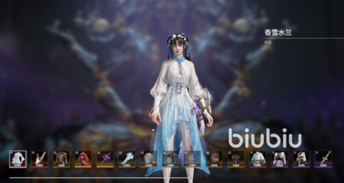 首先是外观【香雪水兰】:空中随风飞舞的雪花随着挥动带出的痕迹缓缓飘落。而轻薄轻盈的纱裙飘然而立,伴随着点点的雪花晶莹闪烁的在身边,淡蓝色的裙摆上有流苏轻轻浮起,就像是冬日中的冰晶沐浴在阳光中。
