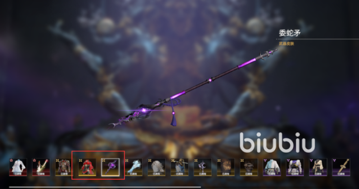 【委蛇矛】委蛇凌风,称霸天下。由上古紫衣朱冠长蛇幻化而成,整体十分细狭,宛若蛇身化为其刃。矫健如风,强劲似松。