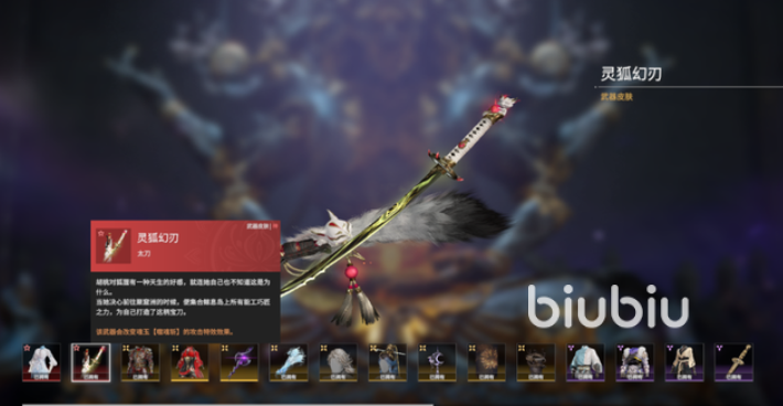 其次是武器外观【灵狐幻刃】,整体刀身都呈现出黑白的水墨渐变之色,狐尾的刀鞘为整体增添了几分俏皮,灵狐的面具别在刀鞘上又为刀身增添了些许的灵动之感,刀鞘的顶部有金线缠绕其上,连结着中间部分的剑穗呈现出华美的亮金色,与深色暗金流体层次分明。将其放置在透光照下,整体显得十分熠熠生辉。刀柄上使用了白玉来雕刻精美的花纹,在柄后镶有华贵的宝石。在护手处还做了特殊的柄状,突出了尖锐红刺,就像灵狐之爪突出。