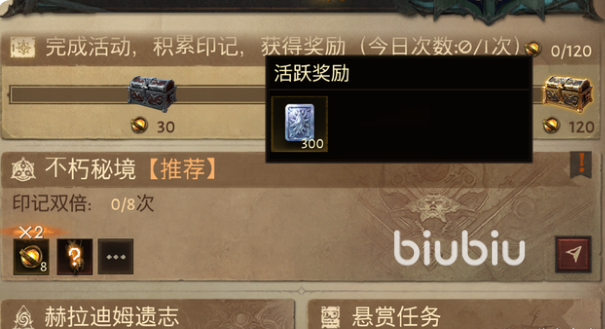 3、第一个搬砖点就是每天的保底任务了,这些是我们每天必须要做的,比如固定日常、悬赏等等,这些都可以按照你的时间安排,最后有固定的队友一条龙来做,当你全部完成就能获得120点的先祖印记,就能获得300白金币了。