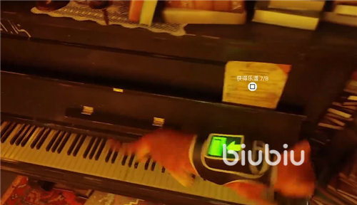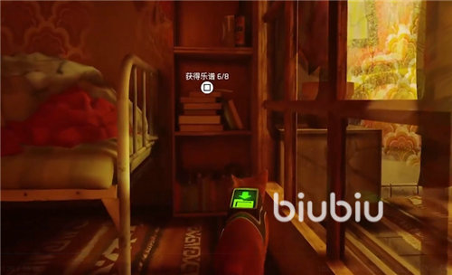 从窗口跳入 MOMO的房间,朝前方的方向望去: 右侧是MOMO,左侧是一张沙发,而在沙发的左侧是一张可以用来抓挠的地毯。然后,你可以看到左侧的一面墙上有扇小窗,这面墙上也有一个三角形的按钮,当来到这面墙的时候,再向左看了一眼,会有一道铁门,你可以通过铁门的缝隙进入到铁门之中,进入铁门之后,从右边的一个盒子跳进去,再次跳进去,现在,第一个乐谱就在木制的垫子上。
