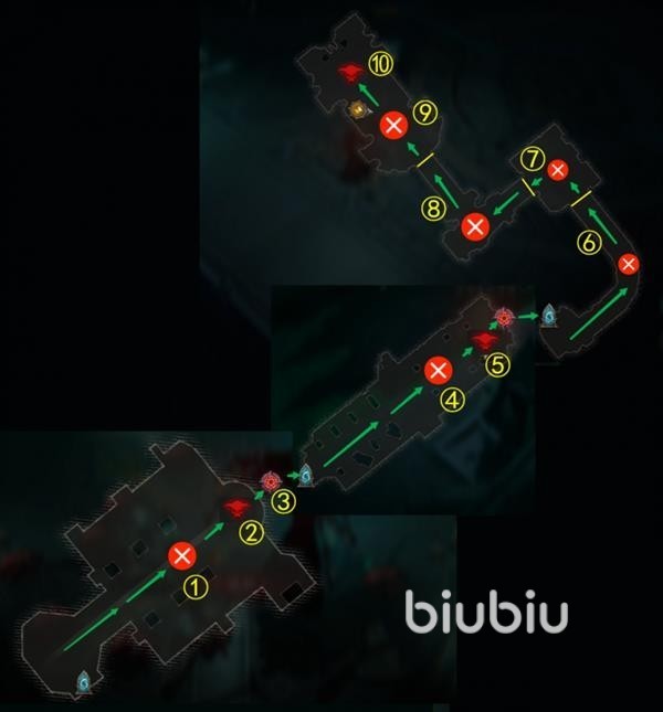 ① 清掉小怪,1号小BOSS戈拉什爵士(哥罗许爵士)出现 → ②击杀戈拉什爵士 → ③穿过传送门 → ④清掉小怪,2号小BOSS马诺克(马诺鲁克)出现 → ⑤击杀马诺克,穿过传送门 → ⑥清怪,门自动打开 → ⑦清怪,门自动打开 → ⑧清怪,门自动打开 → ⑨清掉小怪,大BOSS李奥瑞克(骷髅王)出现 →⑩击杀大BOSS李奥瑞克,结束副本。