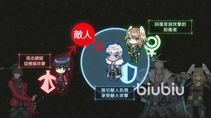 首先小伙伴们得清楚一件事情,本作里面一共有三种不同的战斗定位,分别是攻击者、防卫者以及治疗者,这三者简单一点来说,就是输出手、肉盾以及奶妈,他们三者的擅长领域各不一样。