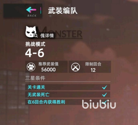 4-6只有12回合,需要56000武装值,其实这一关基本不需要手动操作,主要很多人过不了就是武装值不够,毕竟这款游戏还是有点迟练度的话,小编建议将武装值提升到58000以上再进行该关卡,就会立马三星通关,挂机通关完全没问题。小编这边上的角色是自由滑轮,甜食守卫,电音风暴以及恬静时刻四个角色,并且角色已经升到三星了,如果同学们没法过图的话,可以抄一下这个阵容,其实作为前期关卡,无论什么角色只要武装值达标都能轻松碾压,所以赶紧对照小编所说的建议试试吧。