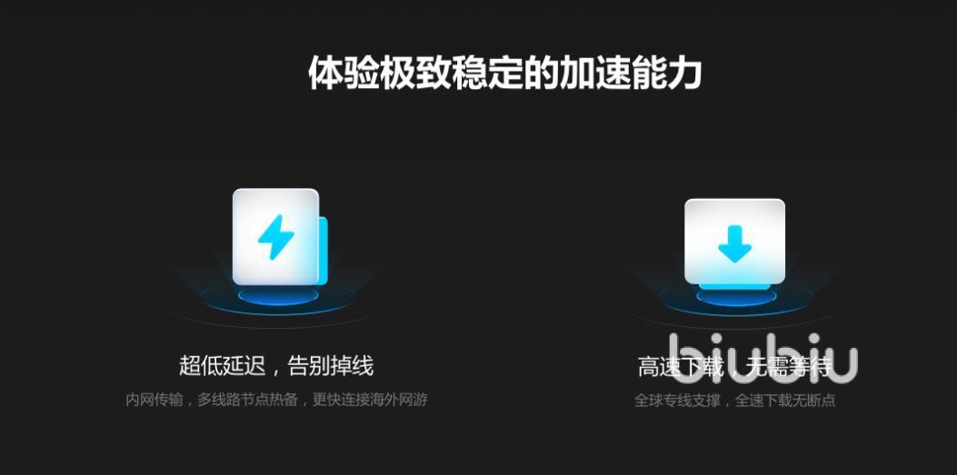 在biubiu加速器这个软件内,制作团队设置了多条专门的线路,保证玩家在游戏过程中,不会出现黑屏、卡顿等任何现象;为了保证游戏的下载速度,还打造了全球专线,确保下载过程万无一失。