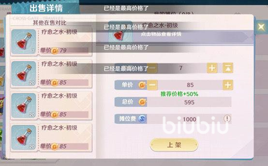2、需要注意的一点是,在每次上架商品的的时候,系统都会收取一定的费用,收取费用的定价为所卖商品定价的1%,不过最低也需要支付1000的币,但是最高也不会超过十万币。游戏中还有一种跨服摆摊,这个的摊位费是规定的,上架时会固定收取一百万币。