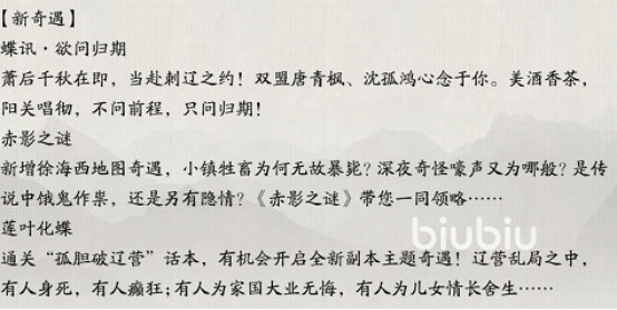 如果各位玩家想要认真体验这次的主线剧情,大概需要一个小时左右的时间。同时,游戏也会更新心得的奇遇,【蝶讯·欲问归期】【赤影之谜】【莲叶化蝶】,这些奇遇都会为主线剧情进行一定量的补充和说明,玩家将在这环环相扣的剧情中保卫这片风雨飘摇的江湖。
