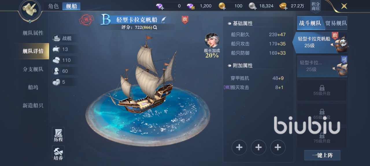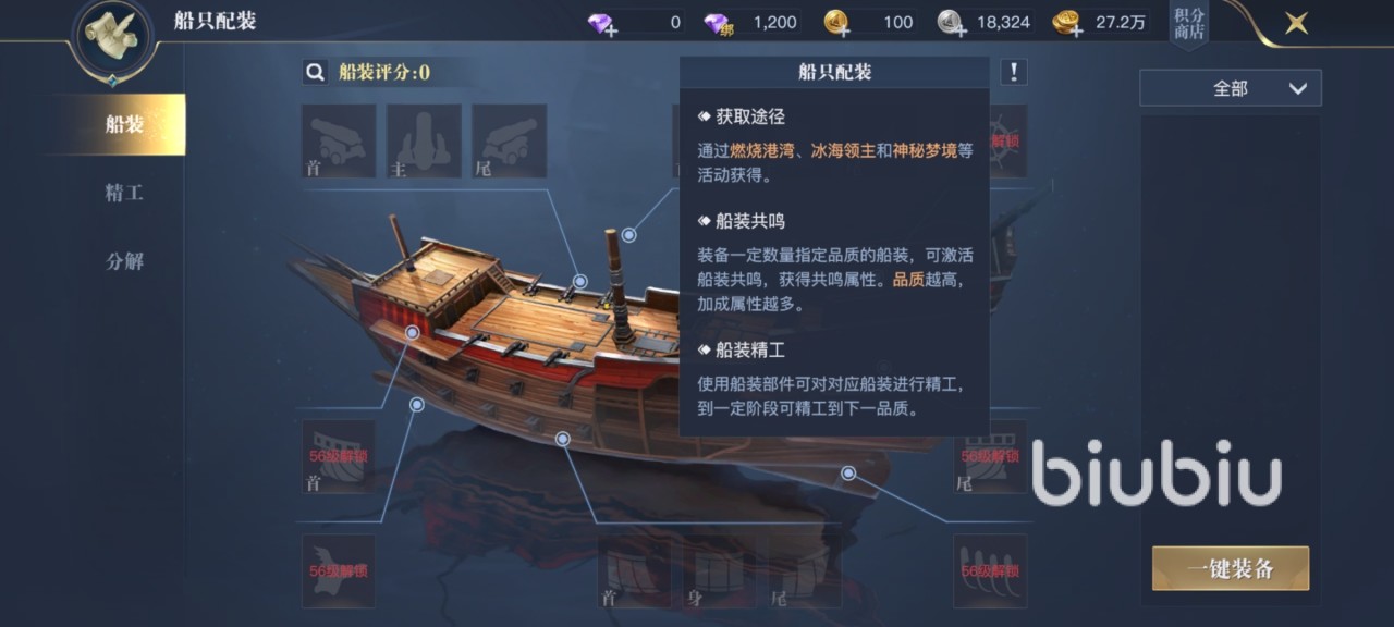 最后就是为船只进行配,装黎明之海中的装备分为角色装备和船只装备两种,获取的途径相同。船的装备分为舰首炮,舰尾炮,主帆,尾帆等不同的类型,品质越高的船只配装,安装上去提升的战力也就越高,这一点和人物装备是一样的,有了船装之后还可以进行精工获取更高的属性。